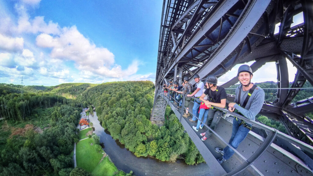 Gemeinsam planen wir eure Teamevent in 100 Metern Höhe und ihr besteigt Stufe für Stufe mit unseren erfahrenen Teamtrainer_Innen die Müngstener Brücke – Deutschlands höchste Eisenbahnbrücke.